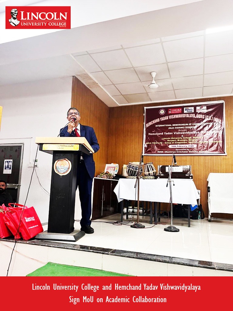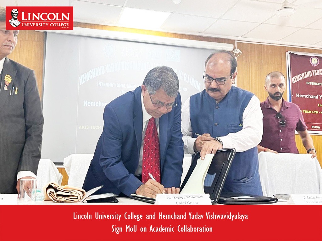 On February 16, 2026, Lincoln University College (LUC), Malaysia, and Hemchand Yadav Vishwavidyalaya, Durg, Chhattisgarh, India, entered into a Memorandum of Understanding (MoU) to strengthen academic cooperation and international engagement. The agreement was signed by LUC Founder and President Prof. Dr. Amiya Bhaumik and Dr. Sanjay Tiwari, Vice Chancellor of Hemchand Yadav Vishwavidyalaya. The collaboration reflects a joint commitment to improving education, increasing research opportunities, and building stronger academic connections between Malaysia and India.
