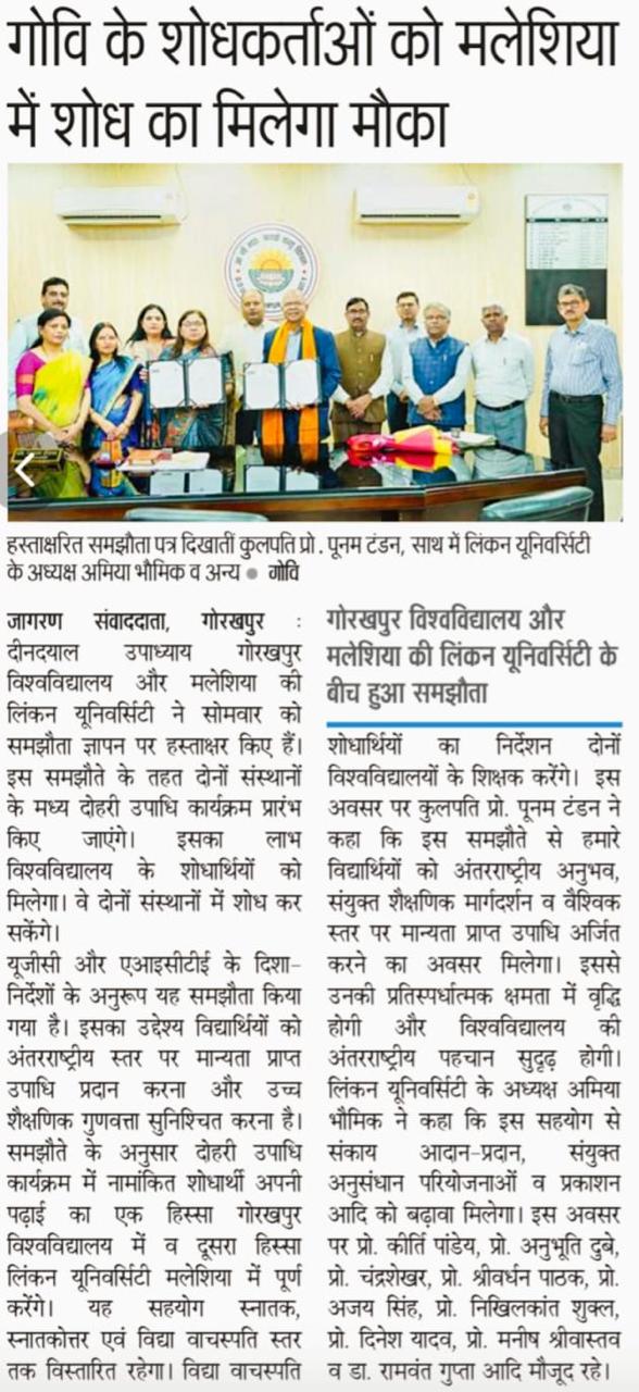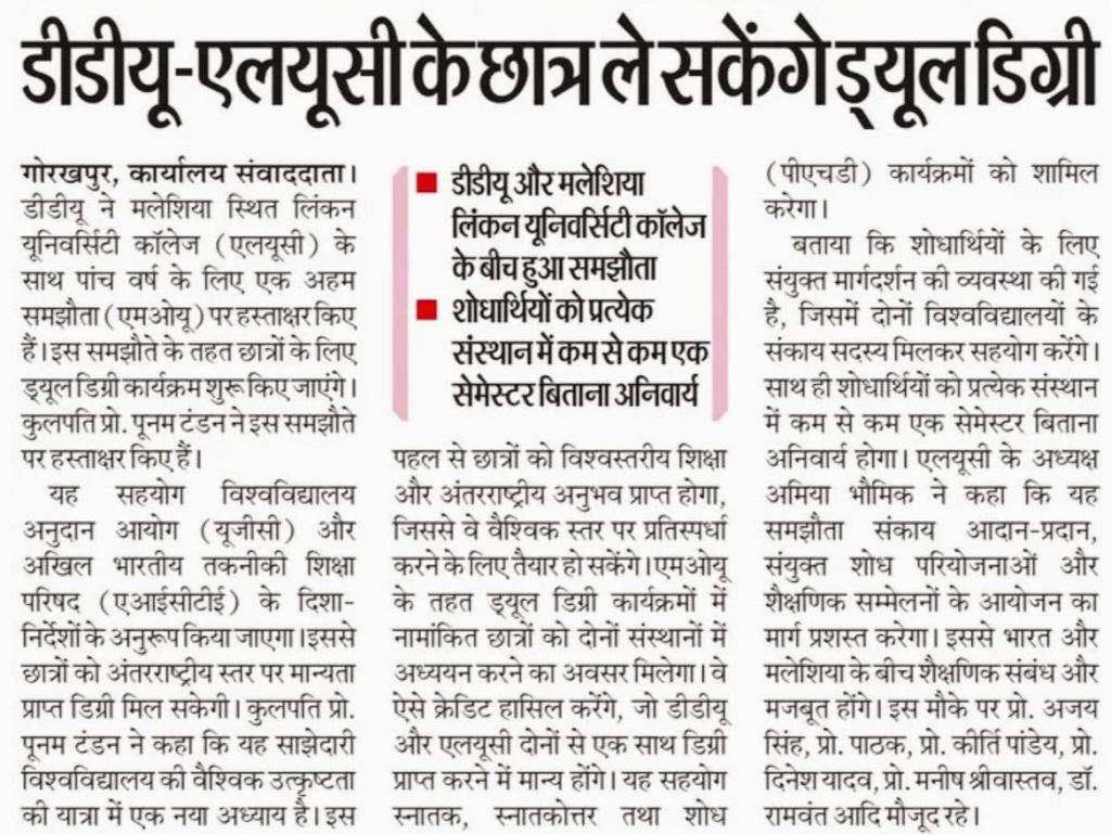 Lincoln University College Signs MoU with Deen Dayal Upadhyaya Gorakhpur University