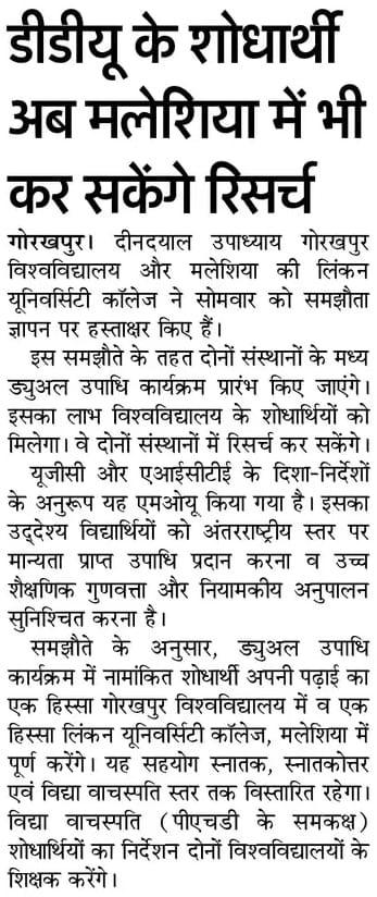 On March 2, 2026, Lincoln University College (LUC), Malaysia, signed a Memorandum of Understanding (MoU) with Deen Dayal Upadhyaya Gorakhpur University (DDUGU), India, to strengthen academic collaboration and expand international research opportunities for students.