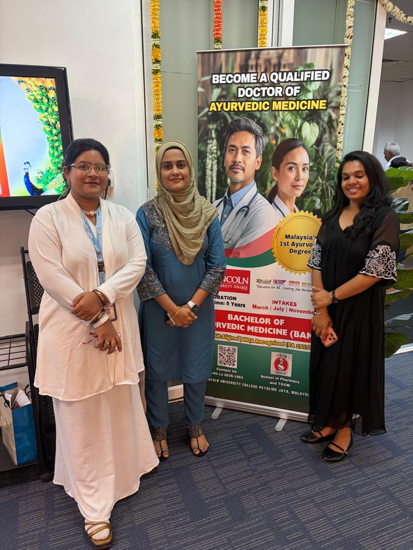 Dr. Salma Vemala, Program Coordinator, Bachelor of Ayurveda along with Dr. Jeetika and Dr. Maneesha, Lincoln University College, Malaysia attended the World Ayurveda Day Celebration at Netaji Subhas Chandra Bose Indian Cultural Centre, Sentral Vista, Kuala Lumpur, Malaysia, organized by the High Commission of India on December 23, 2025. They met Mr. Vivekanand T. S., First Secretary (Commerce & Education), HCI Kuala Lumpur, Dr. Goh Cheng Soon, Director, T&CM Division, Ministry of Health Malaysia, Mr. Meyappan, Dr. Vanita, Dr. Anita, and other delegates. LUC is offering the first Ayurveda bachelor program in Malaysia.