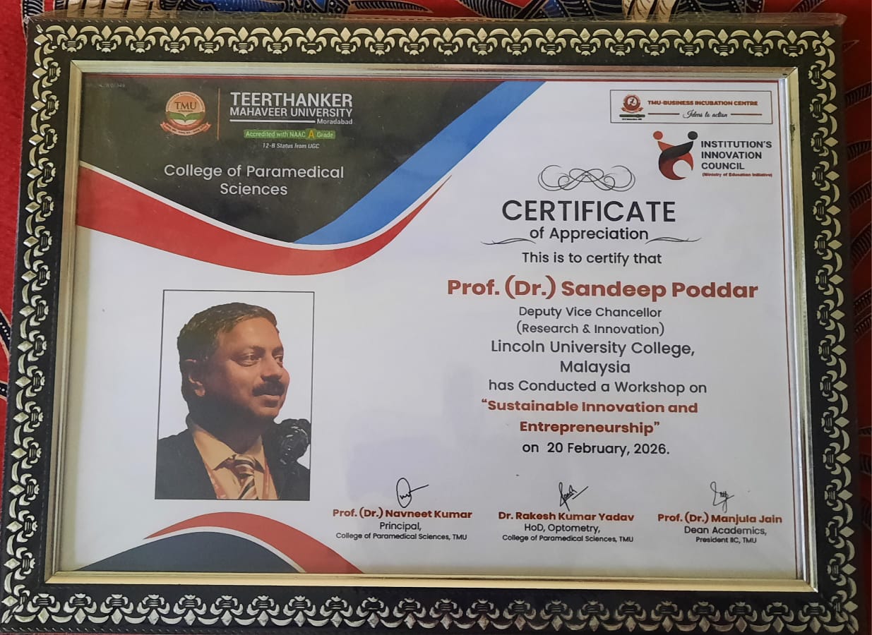Workshop on “Sustainable Innovation and Entrepreneurship” has been organized on February 20, 2026. Prof. Dr. Sandeep Poddar, Deputy Vice Chancellor (Research & Innovation), Lincoln University College, Malaysia interacted with the Allied Health Science students at Teerthanker Mahaveer University, Moradabad, UP, India as resource person.